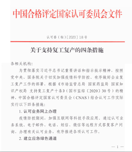 今天,中國合格評定國家認(rèn)可委員會(huì)(CNAS)發(fā)布關(guān)于支持復(fù)工復(fù)產(chǎn)的四條措施。其中一條為減免湖北地區(qū)相關(guān)認(rèn)可技術(shù)服務(wù)收費(fèi)。