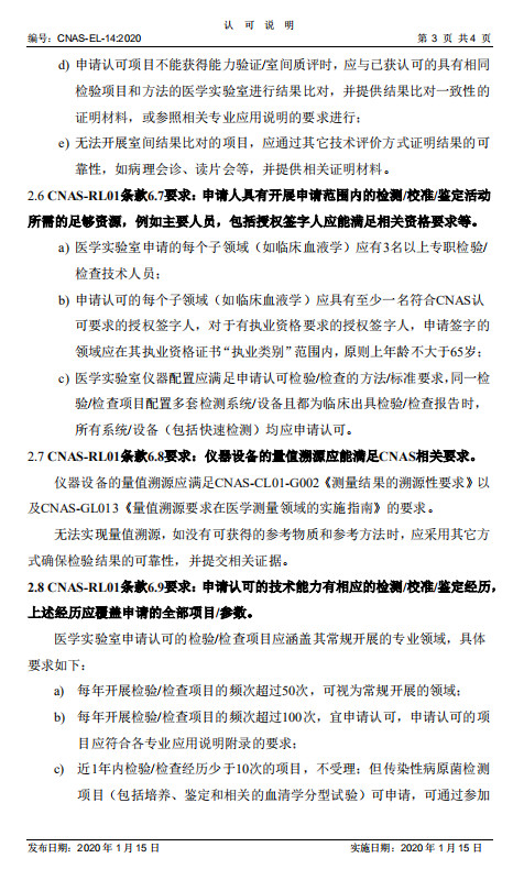 為明確醫(yī)學(xué)實(shí)驗(yàn)室認(rèn)可受理?xiàng)l件,促進(jìn)醫(yī)學(xué)實(shí)驗(yàn)室認(rèn)可制度順利實(shí)施,中國合格評定國家認(rèn)可委員會(CNAS)組織制定了CNAS-EL-14:2020《醫(yī)學(xué)實(shí)驗(yàn)室認(rèn)可受理要求的說明》,對CNAS-RL01《實(shí)驗(yàn)室認(rèn)可規(guī)則》第6章中關(guān)于認(rèn)可條件的相關(guān)要求進(jìn)行了說明。