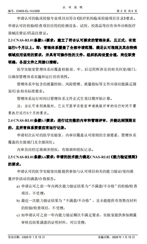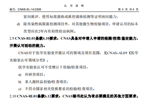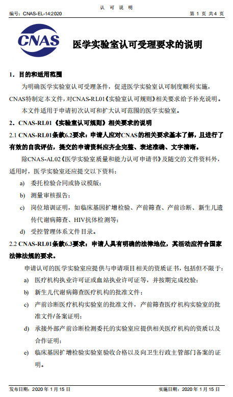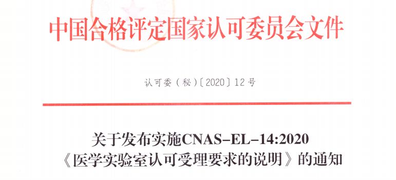 為明確醫(yī)學(xué)實驗室認(rèn)可受理條件,促進醫(yī)學(xué)實驗室認(rèn)可制度順利實施,中國合格評定國家認(rèn)可委員會(CNAS)組織制定了CNAS-EL-14:2020《醫(yī)學(xué)實驗室認(rèn)可受理要求的說明》,對CNAS-RL01《實驗室認(rèn)可規(guī)則》第6章中關(guān)于認(rèn)可條件的相關(guān)要求進行了說明。