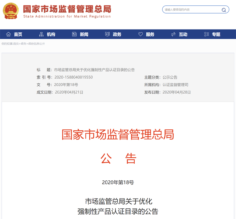 為便利各相關(guān)方準確界定強制性產(chǎn)品認證目錄范圍,市場監(jiān)管總局(認監(jiān)委)重新修訂《強制性產(chǎn)品認證目錄描述與界定表》(見附件),一并予以公布?!秶艺J監(jiān)委關(guān)于發(fā)布強制性產(chǎn)品認證目錄描述與界定表的公告》(認監(jiān)委公告2014年第45號)同時廢止。