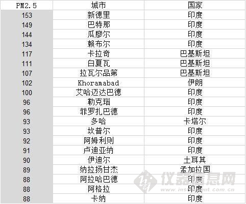 WHO的世界上PM2.5年平均數(shù)值最高的20個(gè)城市排名