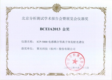 ICP-5000在2013年5月14日舉辦的中國(guó)分析測(cè)試協(xié)會(huì)的專家鑒定會(huì)上,得到了專家們的一致認(rèn)可,均稱贊此產(chǎn)品已經(jīng)達(dá)到國(guó)際同類產(chǎn)品先進(jìn)水平,在2013年10月舉辦的BECIA展會(huì)和2014年5月舉辦的CISILE展會(huì)均得到金獎(jiǎng),在2014年9月MICONEX展會(huì)上,獲得科技成果獎(jiǎng);