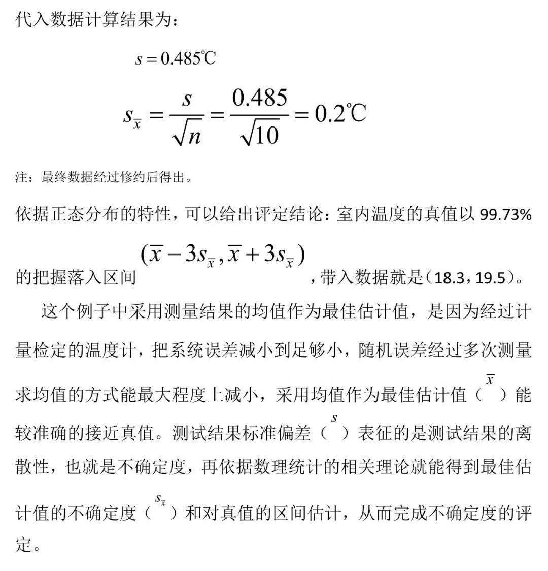 從上面的例子也可以看出,要得到合理的不確定度的評定結(jié)果,必須使用經(jīng)過計量檢定的器具,如果使用的溫度計有較大的系統(tǒng)誤差,不確定度的評定結(jié)果可能就不能包含真值,這樣就失去了不確定度評定的意義。