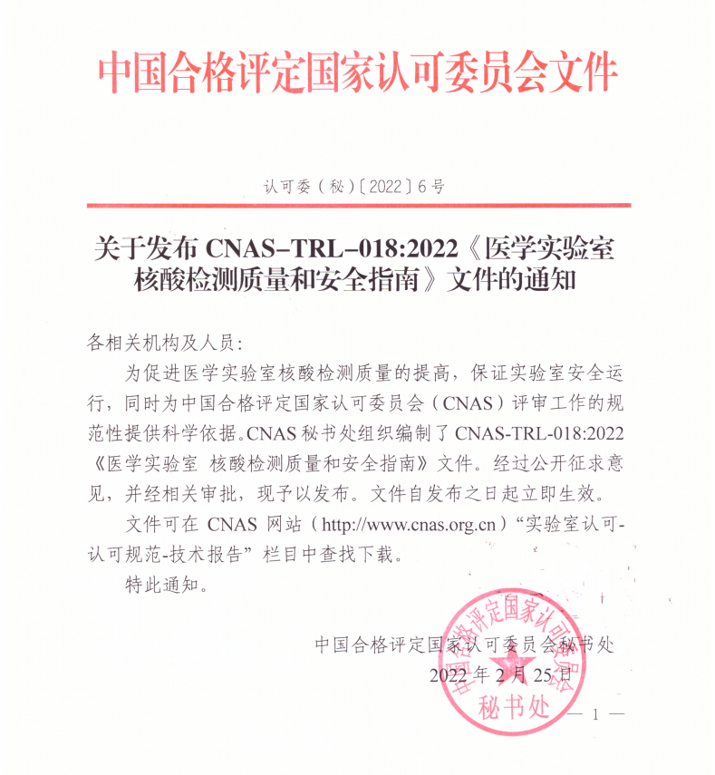 為促進(jìn)醫(yī)學(xué)實(shí)驗(yàn)室核酸檢測質(zhì)量的提高,保證實(shí)驗(yàn)室安全運(yùn)行,同時(shí)為CNAS評審工作的規(guī)范性提供科學(xué)依據(jù)。CNAS 秘書處組織編制了CNAS-TRL-018:2022《醫(yī)學(xué)實(shí)驗(yàn)室核酸檢測質(zhì)量和安全指南》文件。經(jīng)過公開征求意見,并經(jīng)相關(guān)審批,現(xiàn)予以發(fā)布。文件自發(fā)布之日起立即生效。文件可在 CNAS 網(wǎng)站“實(shí)驗(yàn)室認(rèn)可﹣認(rèn)可規(guī)范﹣技術(shù)報(bào)告”欄目中查找下載。