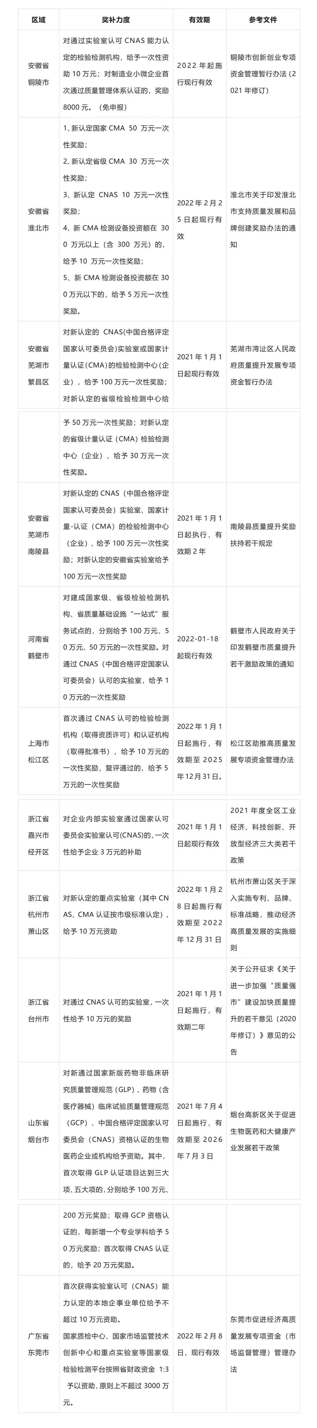 近期,隨著國(guó)務(wù)院印發(fā)《“十四五”市場(chǎng)監(jiān)管現(xiàn)代化規(guī)劃》,提高質(zhì)量認(rèn)證服務(wù)能力與加大認(rèn)可和檢驗(yàn)檢測(cè)改革創(chuàng)新力度被上升到國(guó)家層面,其中重點(diǎn)提及規(guī)劃建設(shè)一批高水平國(guó)家質(zhì)檢中心和檢測(cè)實(shí)驗(yàn)室?,F(xiàn)對(duì)CNAS、CMA認(rèn)證補(bǔ)貼相關(guān)獎(jiǎng)勵(lì)政策做了搜集整理,詳情如下: