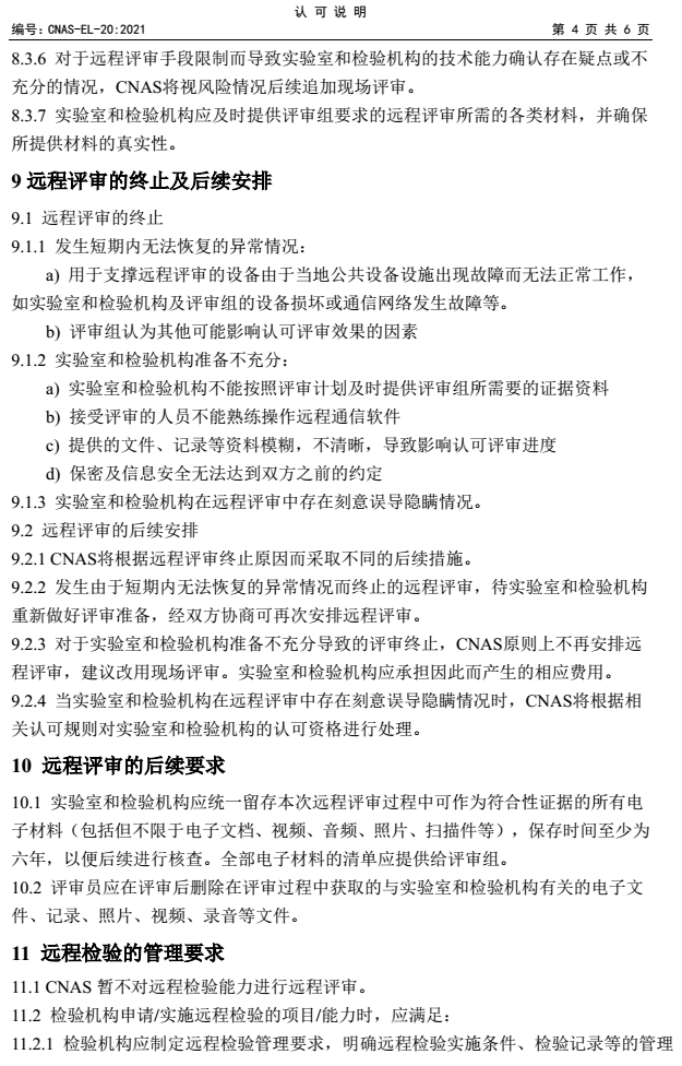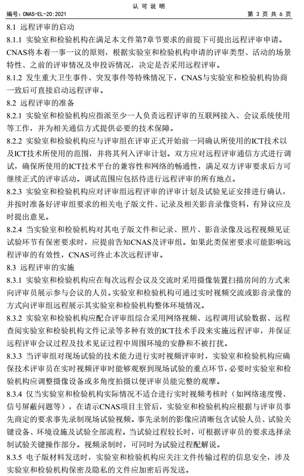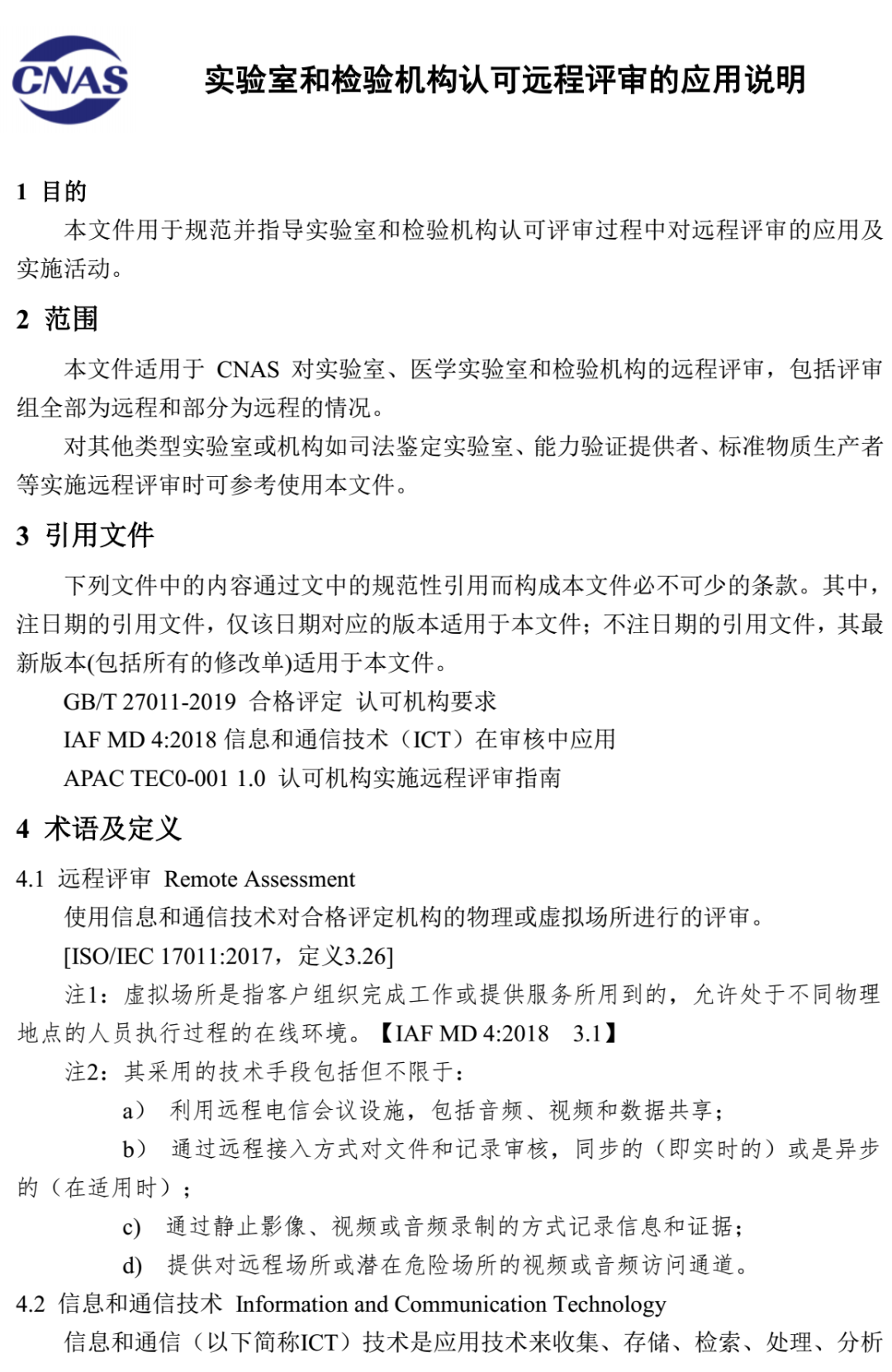 認可規(guī)范文件CNAS-EL-20:2021《實驗室和檢驗機構(gòu)認可遠程評審的應(yīng)用說明》已于去年6月正式發(fā)布實施,該文件用于規(guī)范并指導(dǎo)實驗室和檢驗機構(gòu)認可評審過程中對遠程評審的應(yīng)用及實施活動。