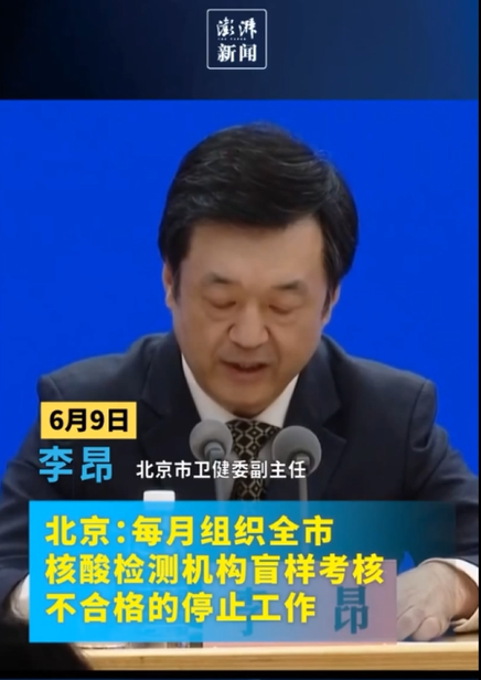 北京市想出了一個(gè)新招。6月9日,北京市宣布每月對(duì)核酸檢測(cè)公司進(jìn)行一次盲樣考核,不合格的停止核酸檢測(cè)工作,整改合格后才允許繼續(xù)營(yíng)業(yè)。