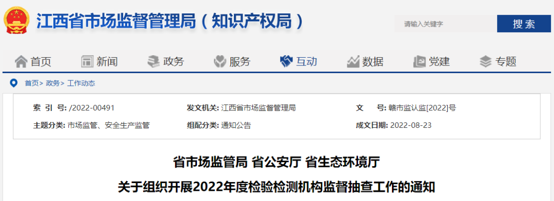 近日,江西省市場監(jiān)管局、省公安廳、省生態(tài)環(huán)境廳聯(lián)合印發(fā)《關(guān)于組織開展2022年度檢驗檢測機構(gòu)監(jiān)督抽查工作的通知》,決定于9月至11月在全省組織開展檢驗檢測機構(gòu)“雙隨機、一公開”監(jiān)督抽查。省級部門聯(lián)合監(jiān)督抽查將機動車、環(huán)境監(jiān)測檢測機構(gòu)作為檢查重點,共隨機抽取75家檢驗檢測機構(gòu)。