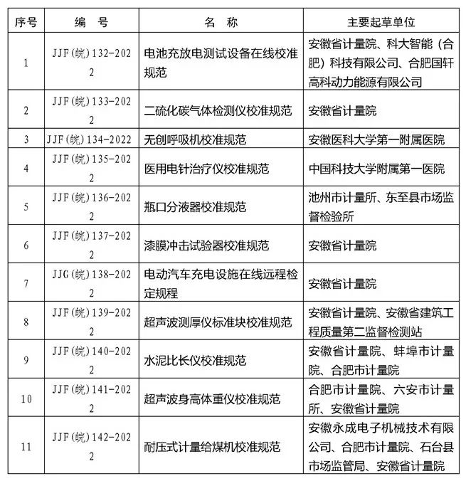 根據(jù)安徽省市場監(jiān)督管理局2022年第52號通告,JJF(皖)132-2022《電池充放電測試設備在線校準規(guī)范》等11項安徽省地方計量技術規(guī)范將于2022年9月30日起實施。