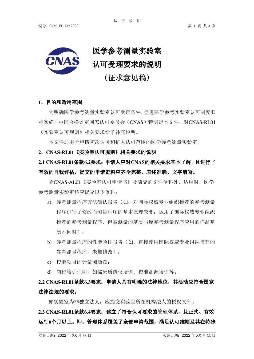 附件1:CNAS-EL-XX:2022《醫(yī)學(xué)參考測(cè)量實(shí)驗(yàn)室認(rèn)可受理要求的說明》(征求意見稿)
