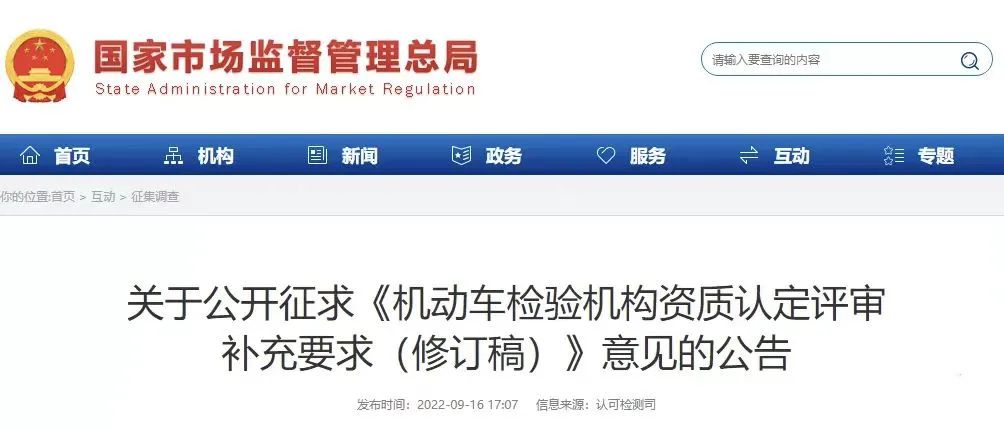 為適應(yīng)機(jī)動車檢驗制度改革優(yōu)化車檢服務(wù)要求,進(jìn)一步規(guī)范機(jī)動車檢驗機(jī)構(gòu)資質(zhì)認(rèn)定評審,市場監(jiān)管總局起草了《機(jī)動車檢驗機(jī)構(gòu)資質(zhì)認(rèn)定評審補充要求(修訂稿)》(附件1)。現(xiàn)向社會公開征求意見。公眾可通過以下途徑和方式提出意見。