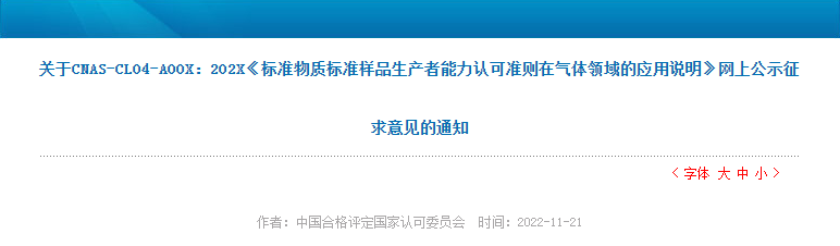 中國合格評定國家認(rèn)可委員會(CNAS)組織制定了CNAS-CL04-A00X:202X《標(biāo)準(zhǔn)物質(zhì)/標(biāo)準(zhǔn)樣品生產(chǎn)者能力認(rèn)可準(zhǔn)則在氣體領(lǐng)域的應(yīng)用說明》。目前已完成文件征求意見稿,現(xiàn)于網(wǎng)上公示征求意見。