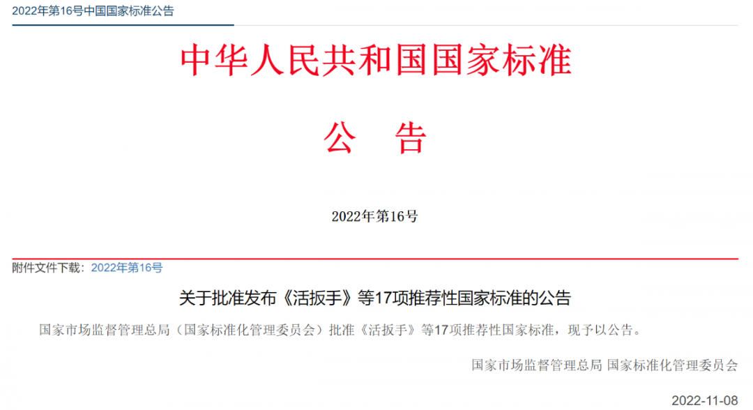 關于批準發(fā)布《活扳手》等17項推薦性國家標準的公告