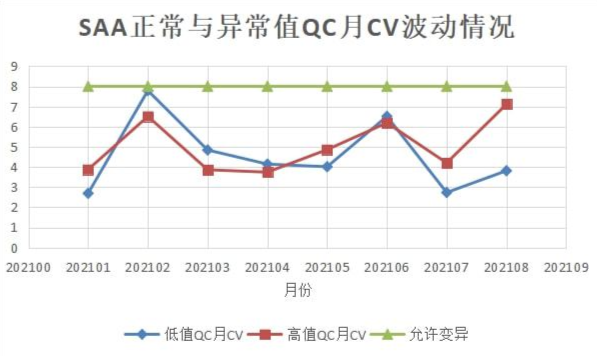 6、觀察室內(nèi)質(zhì)控有無趨勢性變化:在過往質(zhì)控CV變化情況不大,均在實驗室自己設(shè)置的質(zhì)量目標(biāo)范圍內(nèi)。