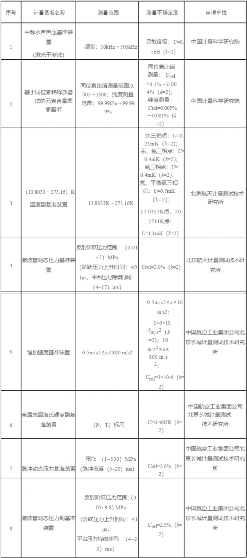 為加強(qiáng)計量體系和能力建設(shè),市場監(jiān)管總局?jǐn)M批準(zhǔn)新建“中頻水聲聲壓基準(zhǔn)裝置(激光干涉法)”“基于同位素稀釋質(zhì)譜法的元素含量國家基準(zhǔn)”“(13.8033~273.16)K溫度副基準(zhǔn)裝置”“激波管動態(tài)壓力基準(zhǔn)裝置”“恒加速度基準(zhǔn)裝置”“金屬表面洛氏硬度副基準(zhǔn)裝置”“脈沖動態(tài)壓力基準(zhǔn)裝置”“激波管動態(tài)壓力副基準(zhǔn)裝置”等8項國家計量基準(zhǔn),以及提升“(15~300)J沖擊能基準(zhǔn)裝置”技術(shù)能力,現(xiàn)予以公示(具體內(nèi)容見附件)。公示截止日期為2024年1月8日。 公示期間,如有不同意見,可實名通過以下途徑和方式提出: 一、通過信函方式將意見郵寄至:北京市海淀區(qū)馬甸東路9號市場監(jiān)管總局計量司量值處 郵編:100088。 二、通過電子郵件將意見發(fā)送至jlslzc@samr.gov.cn。 三、通過傳真將意見發(fā)送至:010-82260132。 附件1:擬新建的國家計量基準(zhǔn)名單 附件2:擬提升技術(shù)能力的國家計量基準(zhǔn)名單 市場監(jiān)管總局計量司 2024年1月2日 附件1 擬新建的國家計量基準(zhǔn)名單 附件2 聲明:本文所用視頻、圖片、文字部分來源于互聯(lián)網(wǎng),版權(quán)屬原作者所有。如涉及到版權(quán)問題,請及時和我們聯(lián)系,核實后協(xié)商處理或刪除。