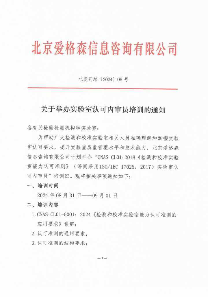為幫助廣大檢測和校準(zhǔn)實(shí)驗(yàn)室相關(guān)人員準(zhǔn)確理解和掌握實(shí)驗(yàn)室認(rèn)可要求,提升實(shí)驗(yàn)室質(zhì)量管理水平和技術(shù)能力,北京愛格森信息咨詢有限公司計(jì)劃舉辦“CNAS-CL01:2018《檢測和校準(zhǔn)實(shí)驗(yàn)室能力認(rèn)可準(zhǔn)則》(等同采用ISO/IEC 17025:2017)實(shí)驗(yàn)室認(rèn)可內(nèi)審員”培訓(xùn)班。