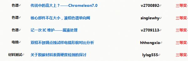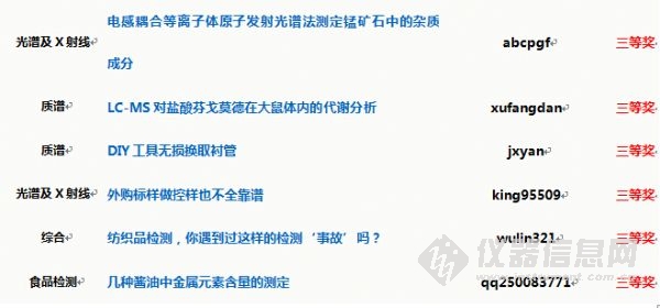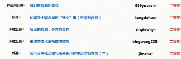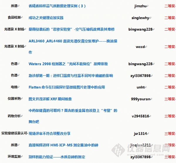 本屆原創(chuàng)大賽設有12個分賽區(qū),分別為:質譜、色譜、光譜及X射線、樣品前處理、電鏡、材料測試、食品檢測、環(huán)境監(jiān)測、藥物分析、實驗室建設及認可、儀器采購、綜合類;征文類型涉及儀器維護維修、儀器使用經(jīng)驗、圖譜解析、分析方法開發(fā)與應用、實驗室管理方法與建設、儀器選型、采購交流等多個方面。歡迎更多的網(wǎng)友們加入進來,分享您的經(jīng)驗與心得。大賽每月各賽區(qū)會評選出月度獲獎作品,大賽結束后將從所有參賽作品中評選出年度優(yōu)秀作品,并發(fā)放證書與禮品進行獎勵!